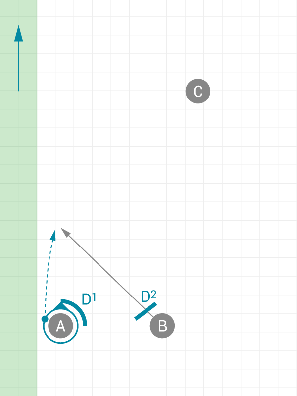 - Fig. 3a: B catches with back to the continuation cutter C. This makes it more difficult to throw continuation.